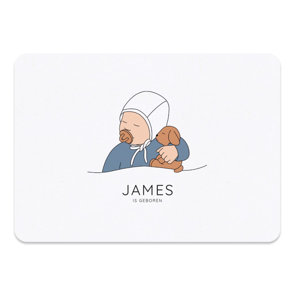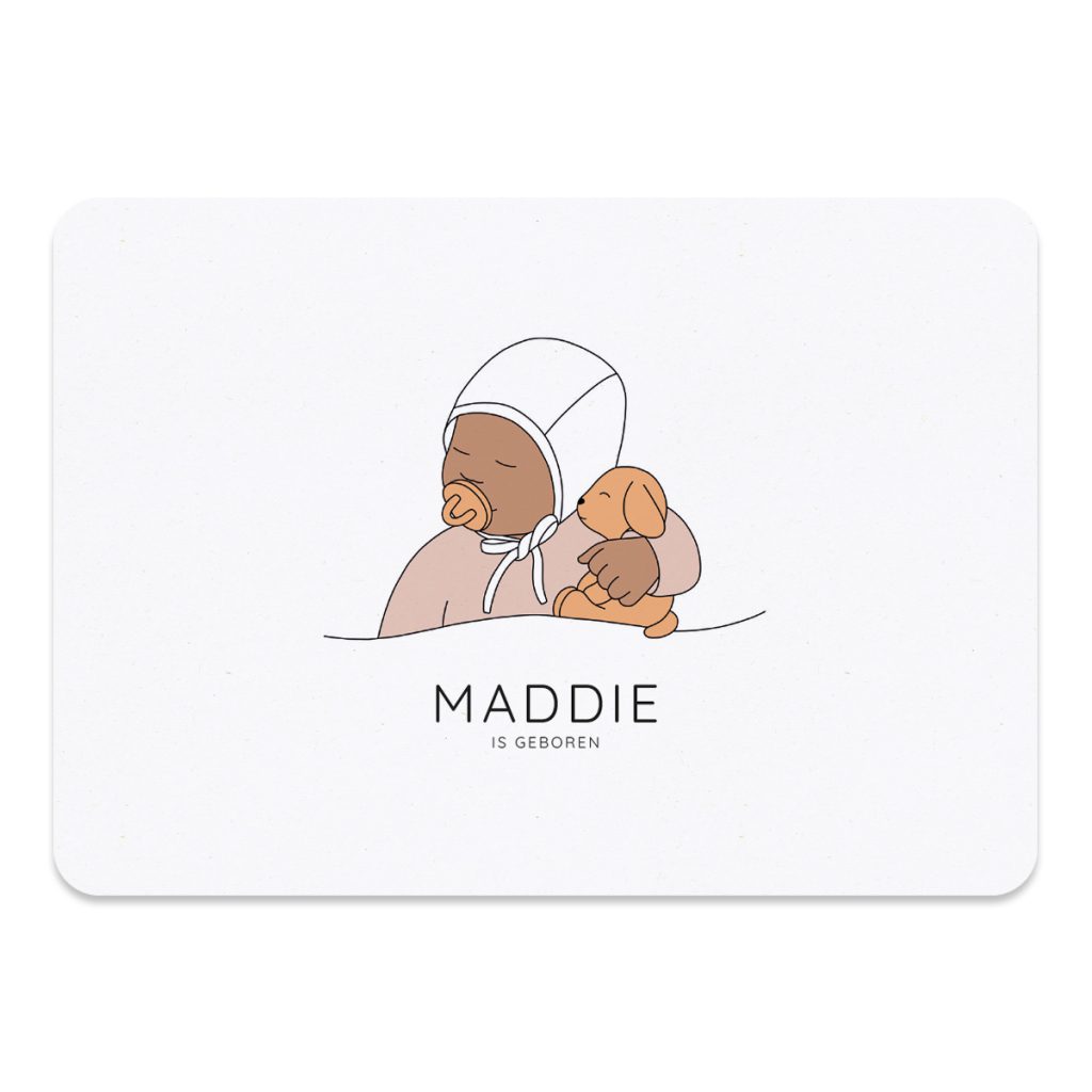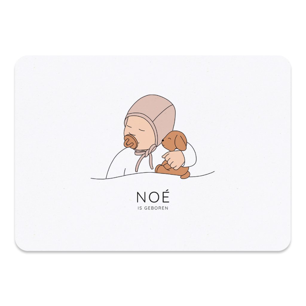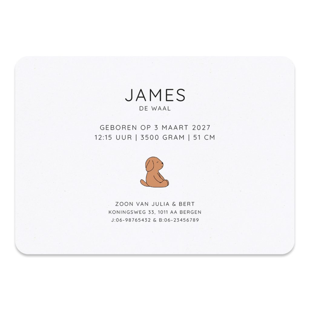 Zo leuk zijn deze twee! Een lieve baby en een knuffel hondje. Het kaartje is A6 formaat (14,8 x 10,5 cm) en heeft ronde hoeken. Het geboortekaartje baby en hondje wordt gedrukt op mat gerecycled papier. Het papier heeft een lichte natuurlijke tint en de vezels van het papier zijn licht zichtbaar. Het geeft het kaartje een mooie zachte, warme en elegante uitstraling.