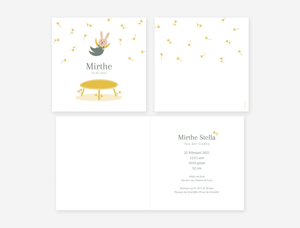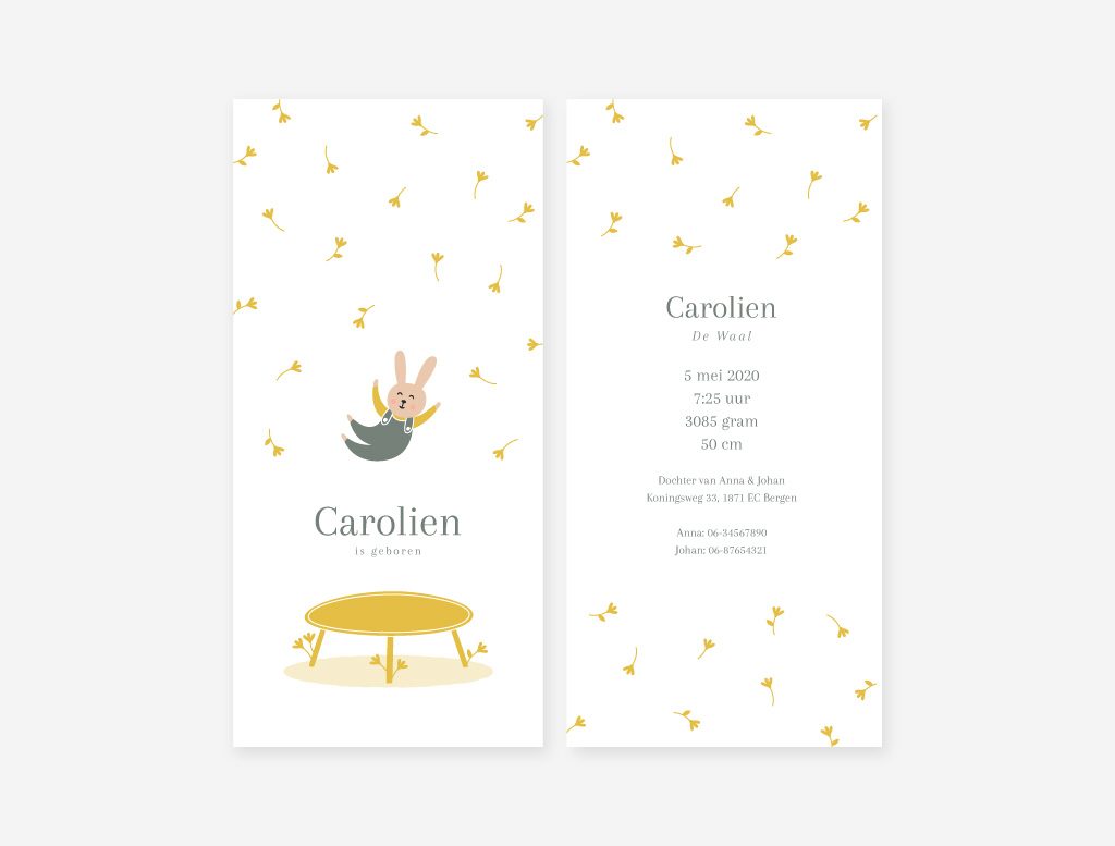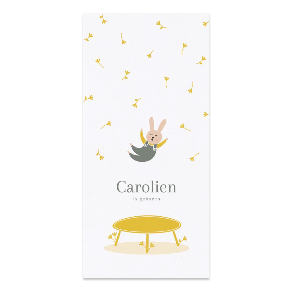 Op het geboortekaartje konijntje staat een mooie illustratie van een lief en vrolijk konijntje die op een trampoline aan het springen is.