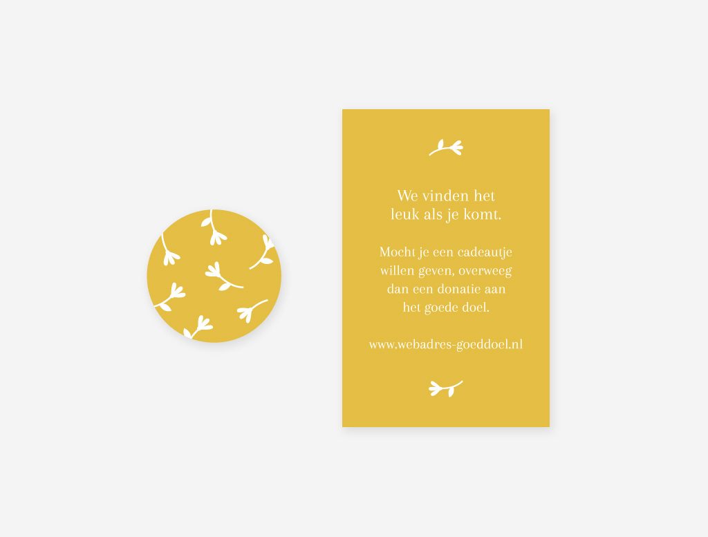 Kleuren en het lettertype pas ik naar wens aan. Ook is het mogelijk het kaartje in een ander formaat of op een ander soort papier te bestellen. Bekijk de opties op deze pagina. Op het bestelformulier kun je je wensen aangeven. Heb je een vraag, stuur me dan gerust een berichtje.