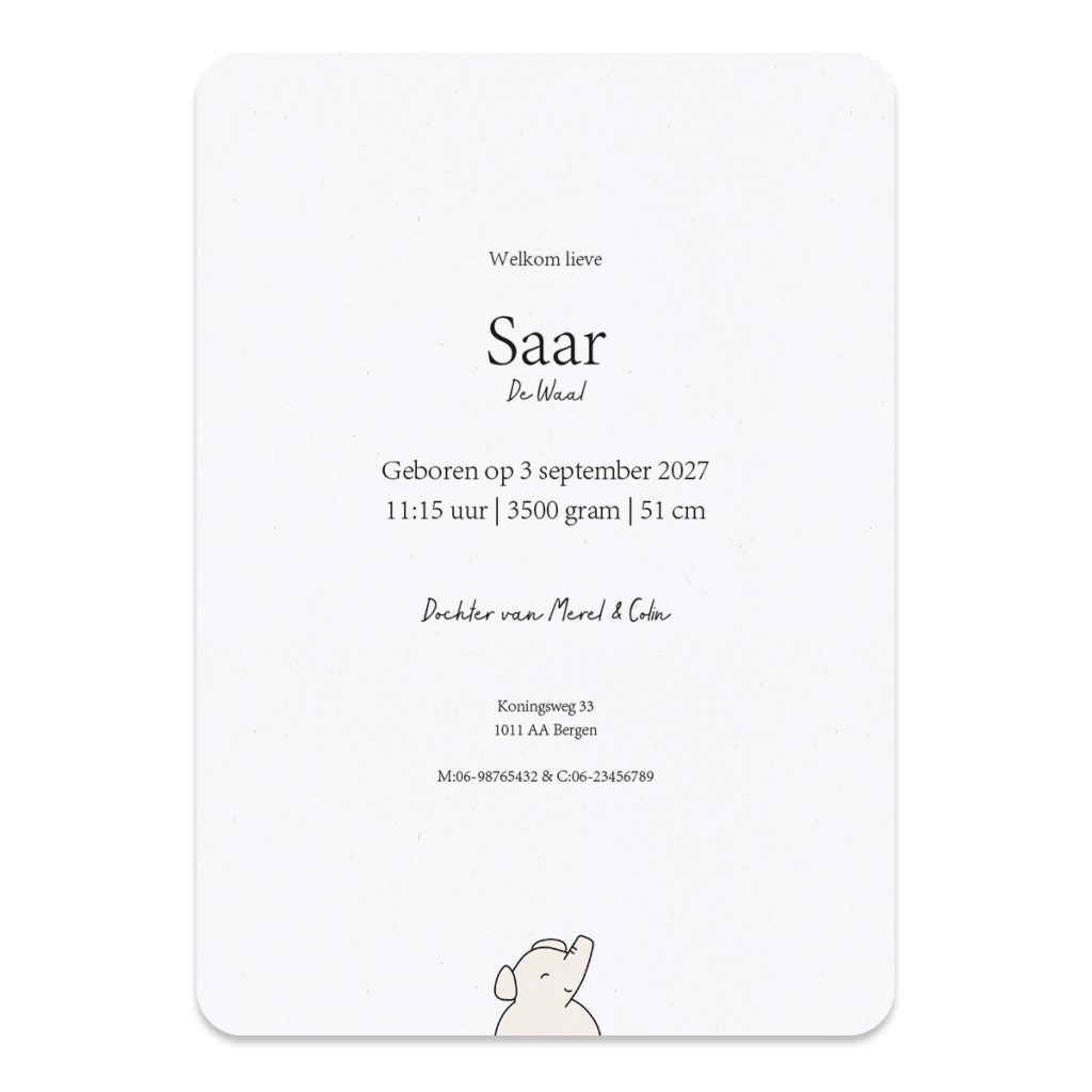 Het geboortekaartje meisje met olifantje is lief en vrolijk. Het kaartje is A6 formaat (14,8 x 10,5 cm) en heeft ronde hoeken. Het geboortekaartje meisje met olifantje wordt gedrukt op mat gerecycled papier. Het papier heeft een lichte natuurlijke tint en de vezels van het papier zijn licht zichtbaar. Het geeft het kaartje een mooie zachte, warme en elegante uitstraling.