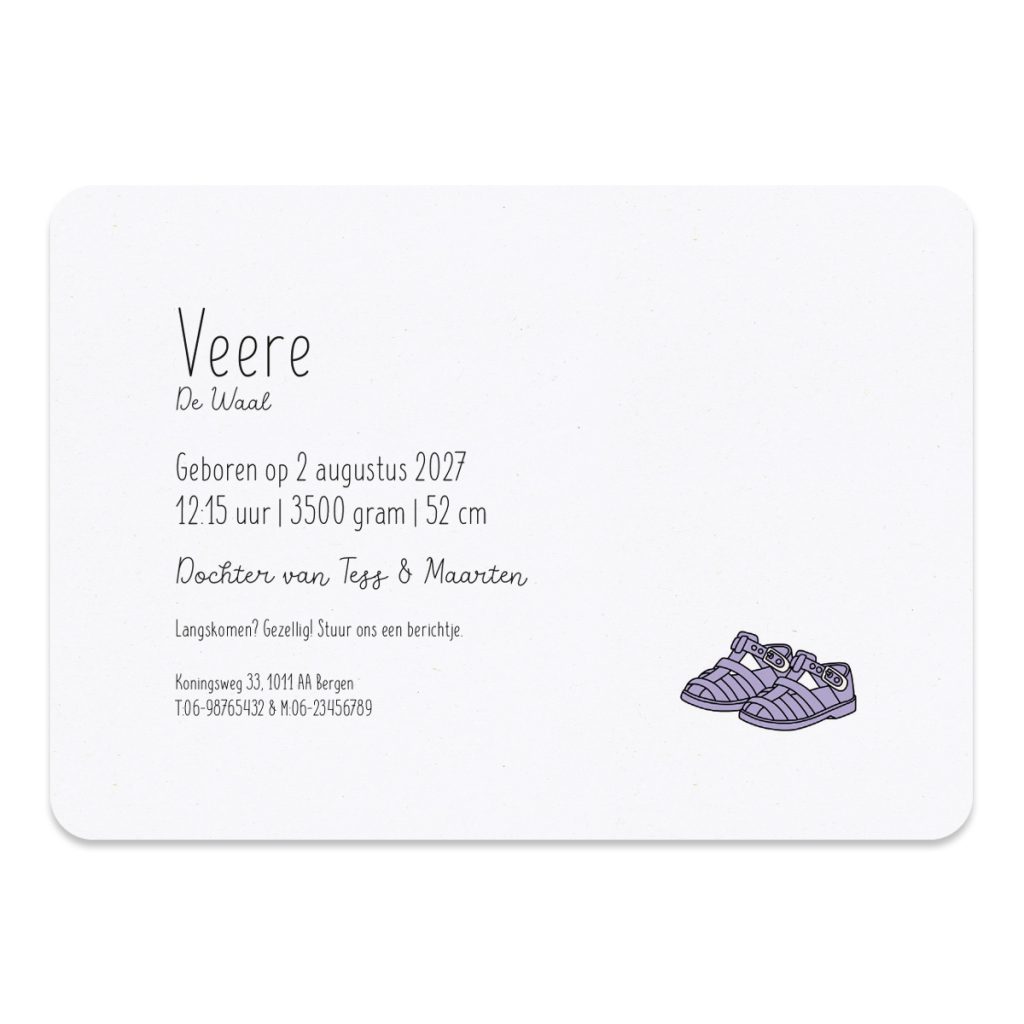 Een stijlvol en zomers geboortekaartje voor de strand en water liefhebbers. Met op het kaartje een paar schattige waterschoentjes, badpakje, zonnebril en schelpjes. Het formaat van het kaartje is vierkant gevouwen (13,5 x 13,5 cm). Maar deze kan ook besteld worden als enkel kaartje met of zonder ronde hoeken. Het geboortekaartje meisje zomer wordt gedrukt op mat gerecycled papier. Dit papier heeft een lichte natuurlijke tint en de vezels van het papier zijn licht zichtbaar. Dit geeft het kaartje een mooie zachte, warme en elegante uitstraling.