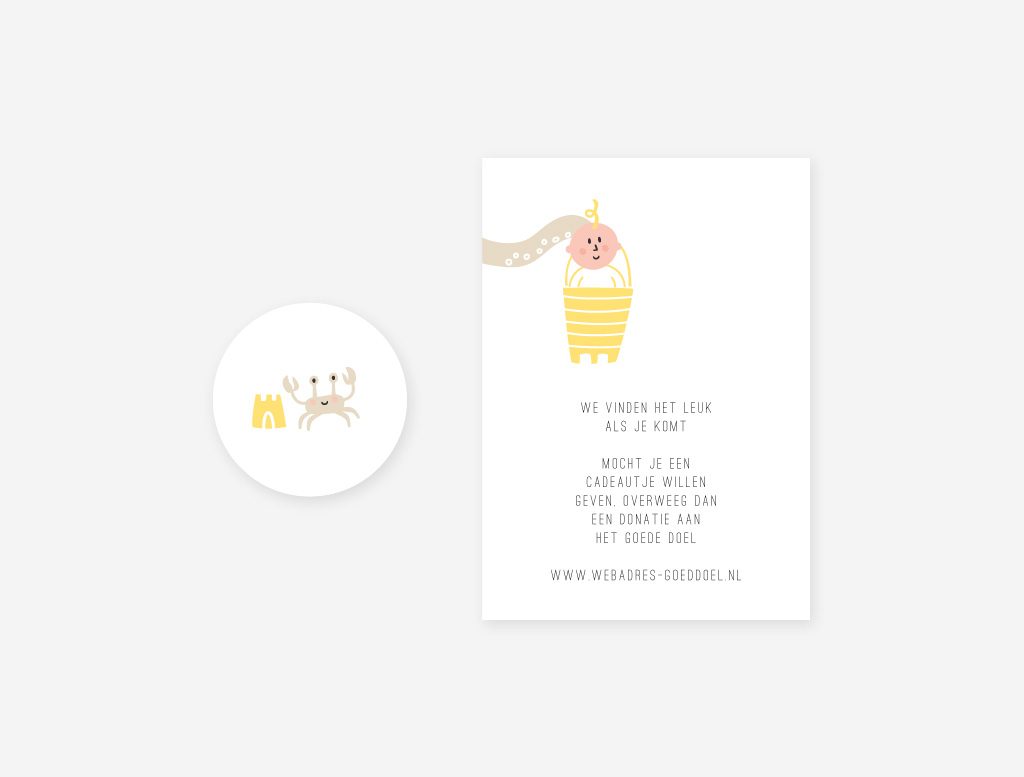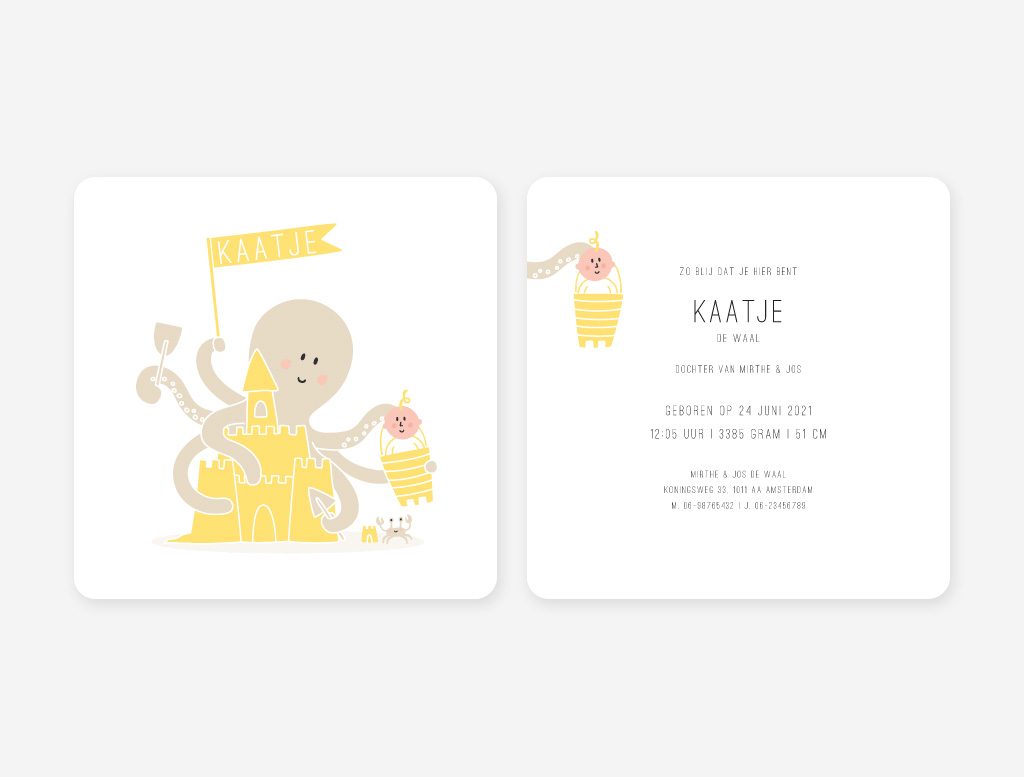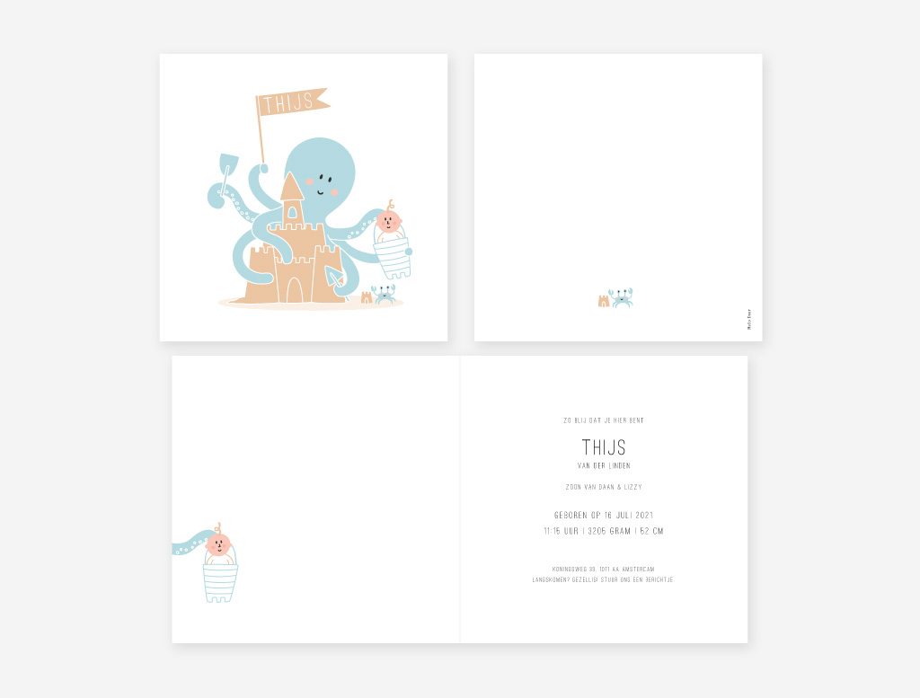 Een rustig en vrolijk geboortekaartje met een octopus, krab en jullie lieve baby. Het kaartje is 13,5 x 13,5cm en heeft ronde hoeken. Het geboortekaartje octopus wordt gedrukt op mat gerecycled papier. Het papier heeft een lichte natuurlijke tint en de vezels van het papier zijn licht zichtbaar. Het geeft het kaartje een mooie zachte en elegante uitstraling.