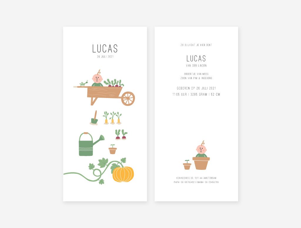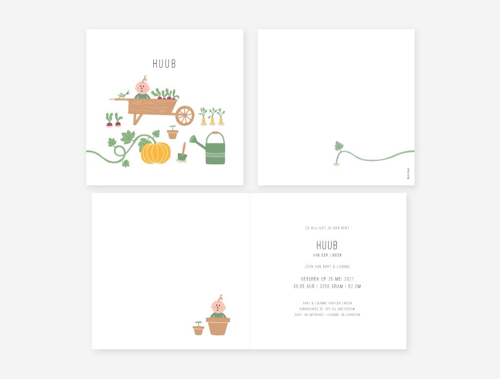 Op het geboortekaartje tuintje staat een vrolijk en speels ontwerp van een baby in een moestuintje. Het ontwerp wordt gedrukt op gerecycled papier. Dit geeft het kaartje een natuurlijke en zachte uitstraling.