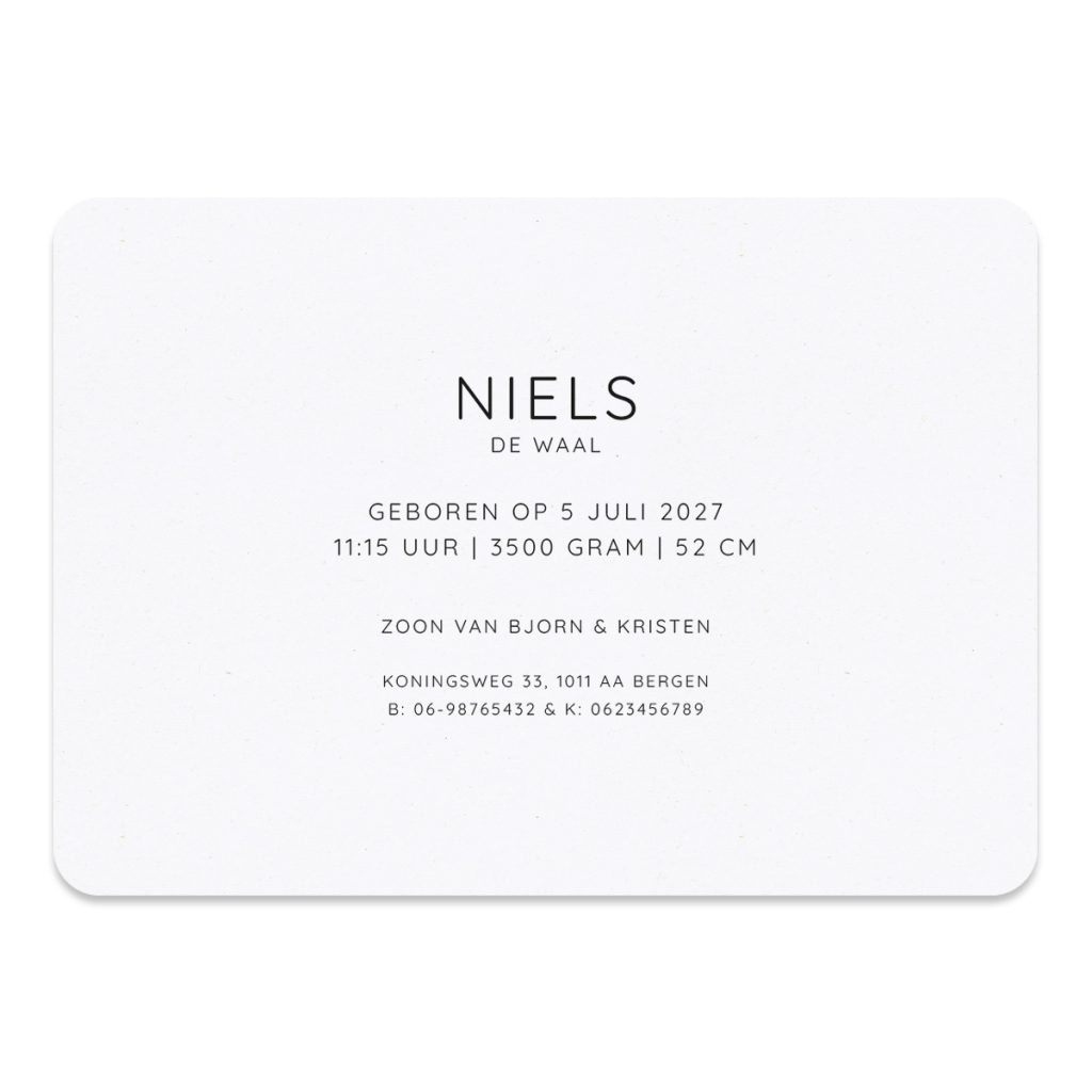 Op je beeldscherm kunnen kleuren net even anders ogen dan op papier. Graag een proefdruk van het geboortekaartje? Deze kun je bestellen voor € 7,50. Bestel de proefdruk via het bestelformulier.