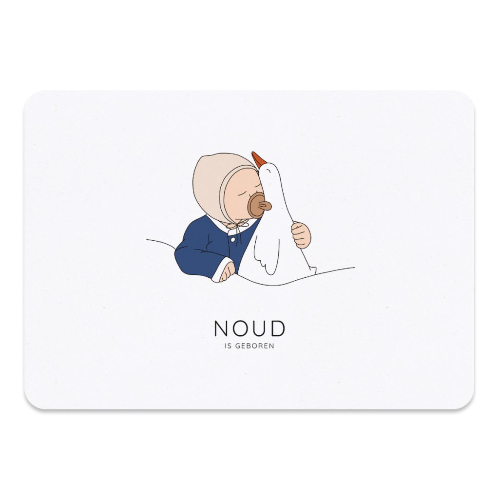 Een lief en bijzonder geboortekaartje met een mooie illustratie van een baby en gans. Het kaartje is A6 formaat (14,8 x 10,5 cm) en heeft ronde hoeken. Het geboortekaartje baby en gans wordt gedrukt op mat gerecycled papier. Het papier heeft een lichte natuurlijke tint en de vezels van het papier zijn licht zichtbaar. Het geeft het kaartje een mooie zachte, warme en elegante uitstraling.