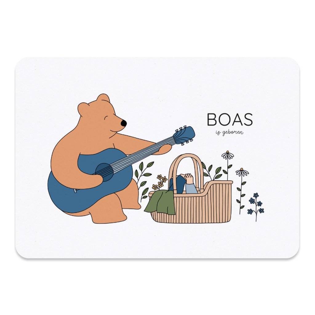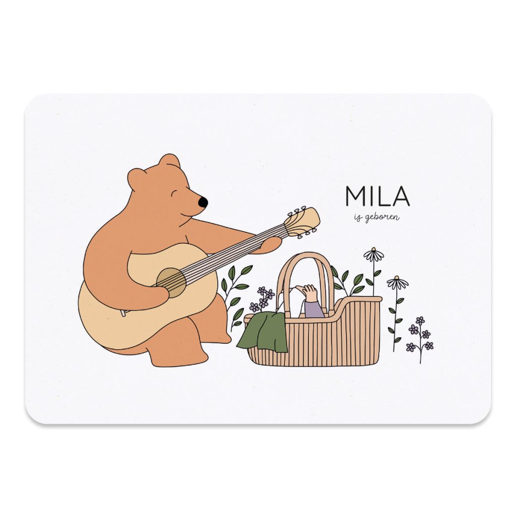 Het geboortekaartje beer met gitaar. Een vrolijk en elegant geboortekaartje met een minimalistische uitstraling. Het kaartje is A6 formaat (14,8 x 10,5 cm) en heeft ronde hoeken. Het geboortekaartje beer met gitaar wordt gedrukt op mat gerecycled papier. Het papier heeft een lichte natuurlijke tint en de vezels van het papier zijn licht zichtbaar. Het geeft het kaartje een mooie zachte, warme en elegante uitstraling.