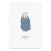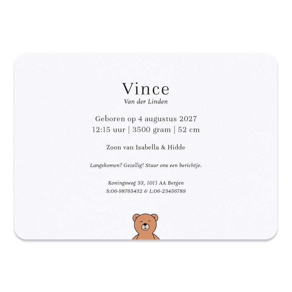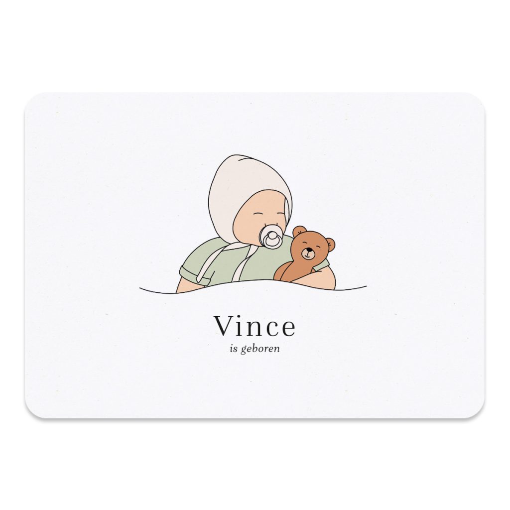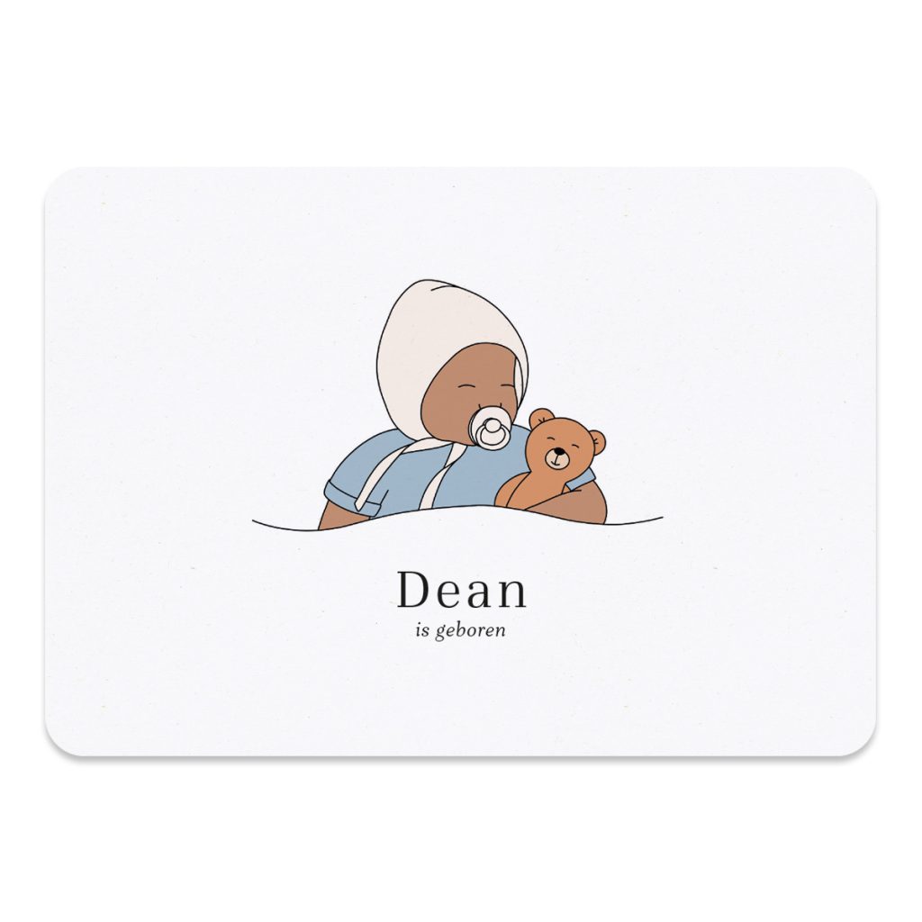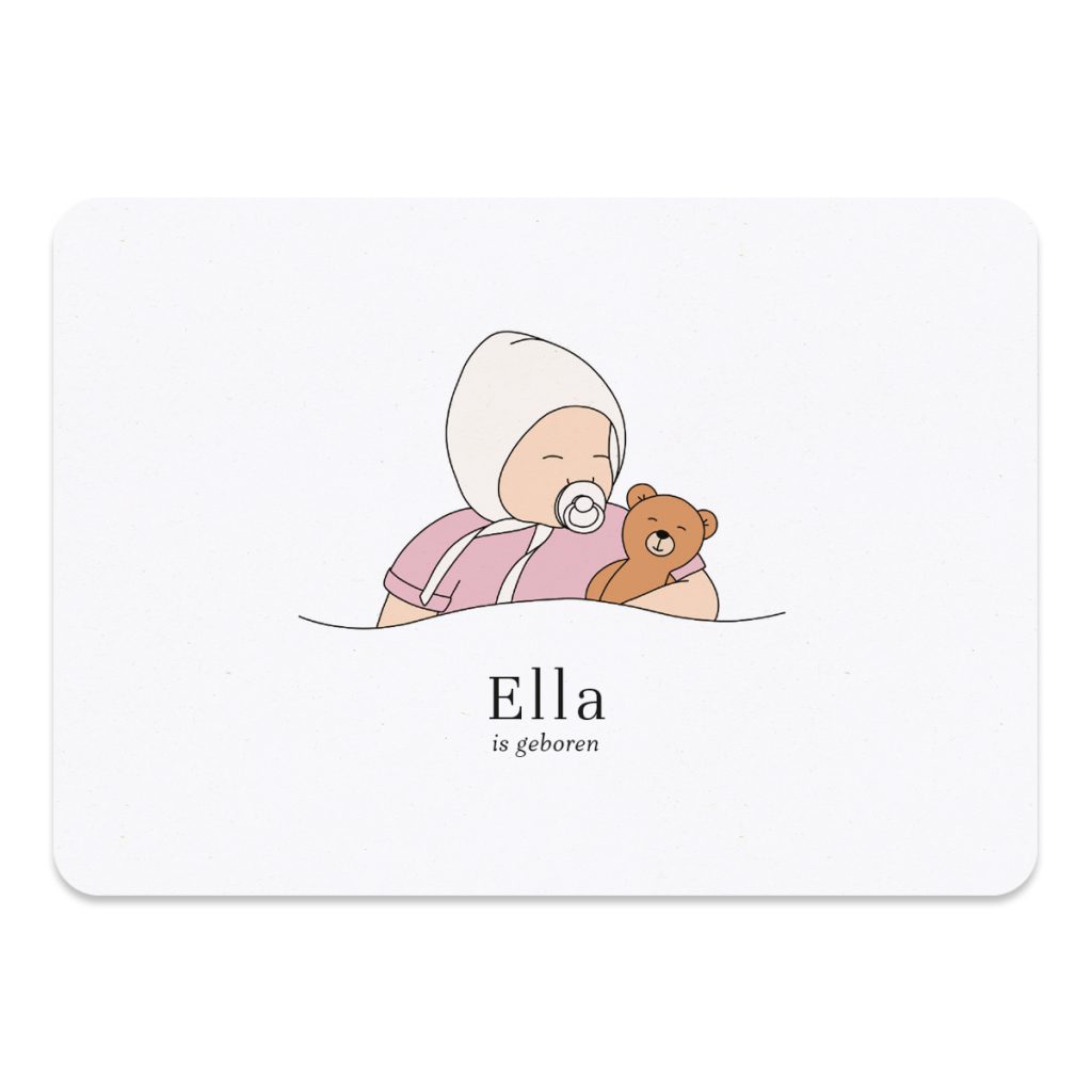 Een vrolijk geboortekaartje met een lief kindje en een knuffelbeer. Het kaartje is A6 formaat (14,8 x 10,5 cm) en heeft ronde hoeken. Het geboortekaartje kindje met beer wordt gedrukt op mat gerecycled papier. Het papier heeft een lichte natuurlijke tint en de vezels van het papier zijn licht zichtbaar. Het geeft het kaartje een mooie zachte en elegante uitstraling.
