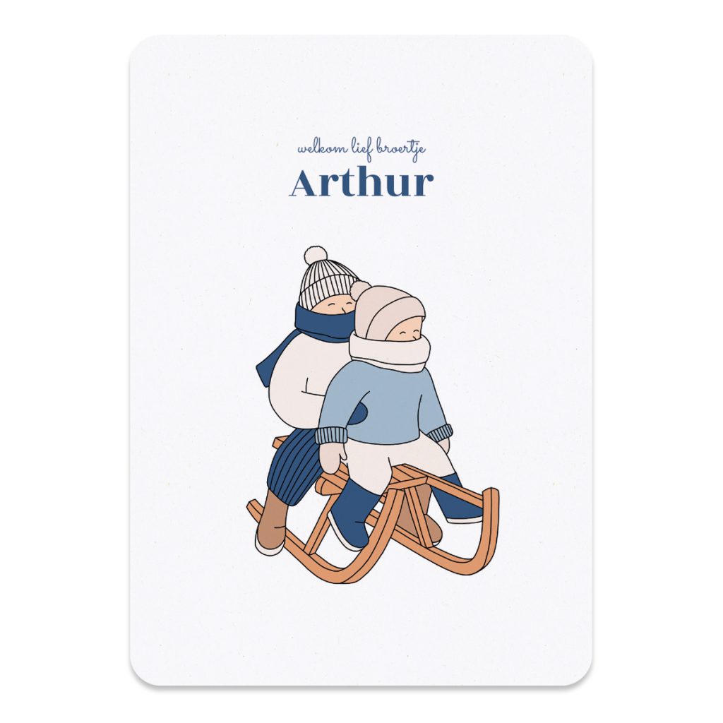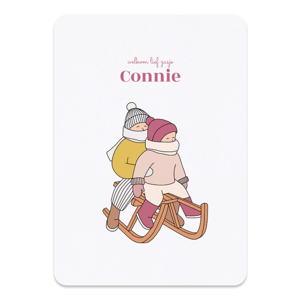 Een grote broer of zus met een klein broertje of zusje op de slee. Een vrolijk en winters geboortekaartje met een minimalistische uitstraling. Het kaartje is A6 formaat (14,8 x 10,5 cm) en heeft ronde hoeken. Het geboortekaartje kindjes op slee wordt gedrukt op mat gerecycled papier. Het papier heeft een lichte natuurlijke tint en de vezels van het papier zijn licht zichtbaar. Het geeft het kaartje een mooie zachte, warme en elegante uitstraling.