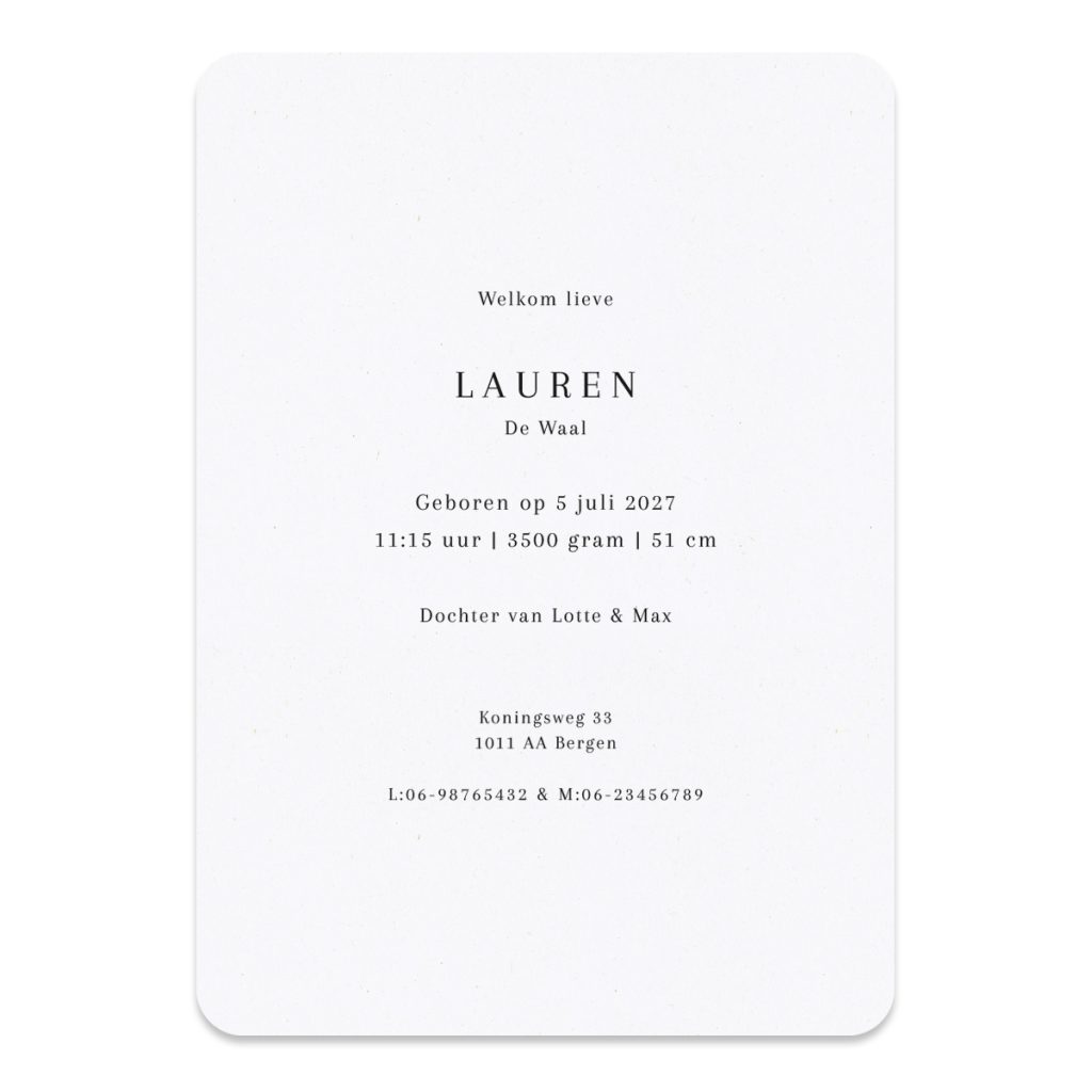 - De geboortekaartjes worden gedrukt, verstuurd en binnen drie werkdagen bij je thuis afgeleverd.