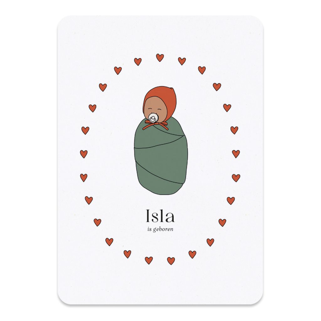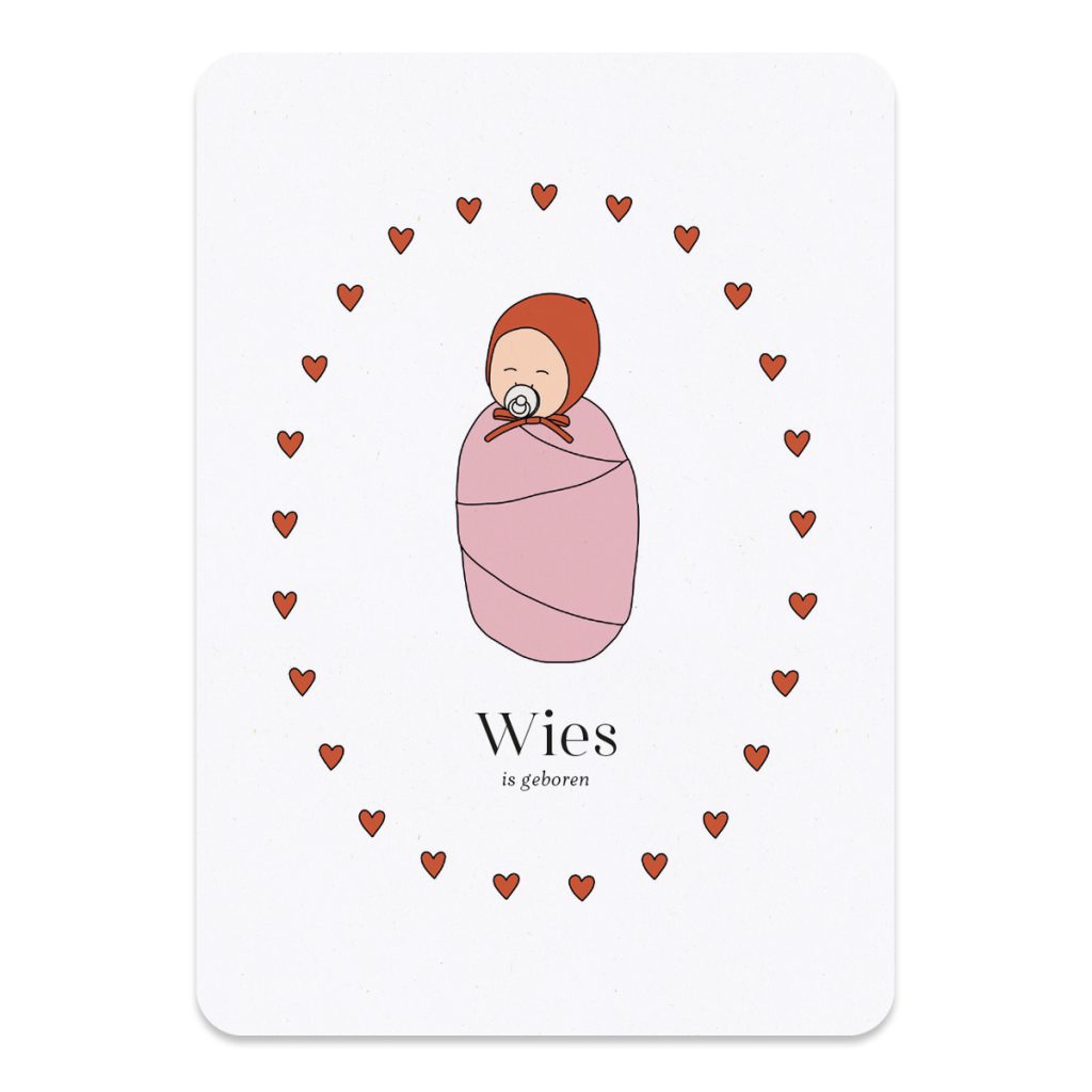 Het geboortekaartje met hartjes voor een meisje. Het geboortekaartje wordt gedrukt op gerecycled papier.