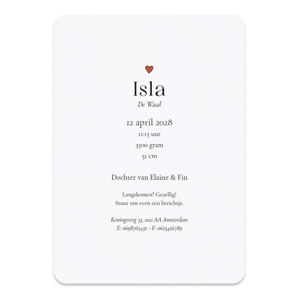 Een lief kindje om voor altijd van te houden. Dit geboortekaartje met hartjes is elegant, vrolijk en vol liefde. Het kaartje is A6 formaat (14,8 x 10,5 cm) en heeft ronde hoeken. Het geboortekaartje wordt gedrukt op mat gerecycled papier. Het papier heeft een lichte natuurlijke tint en de vezels van het papier zijn licht zichtbaar. Het geeft het kaartje een mooie zachte en elegante uitstraling.