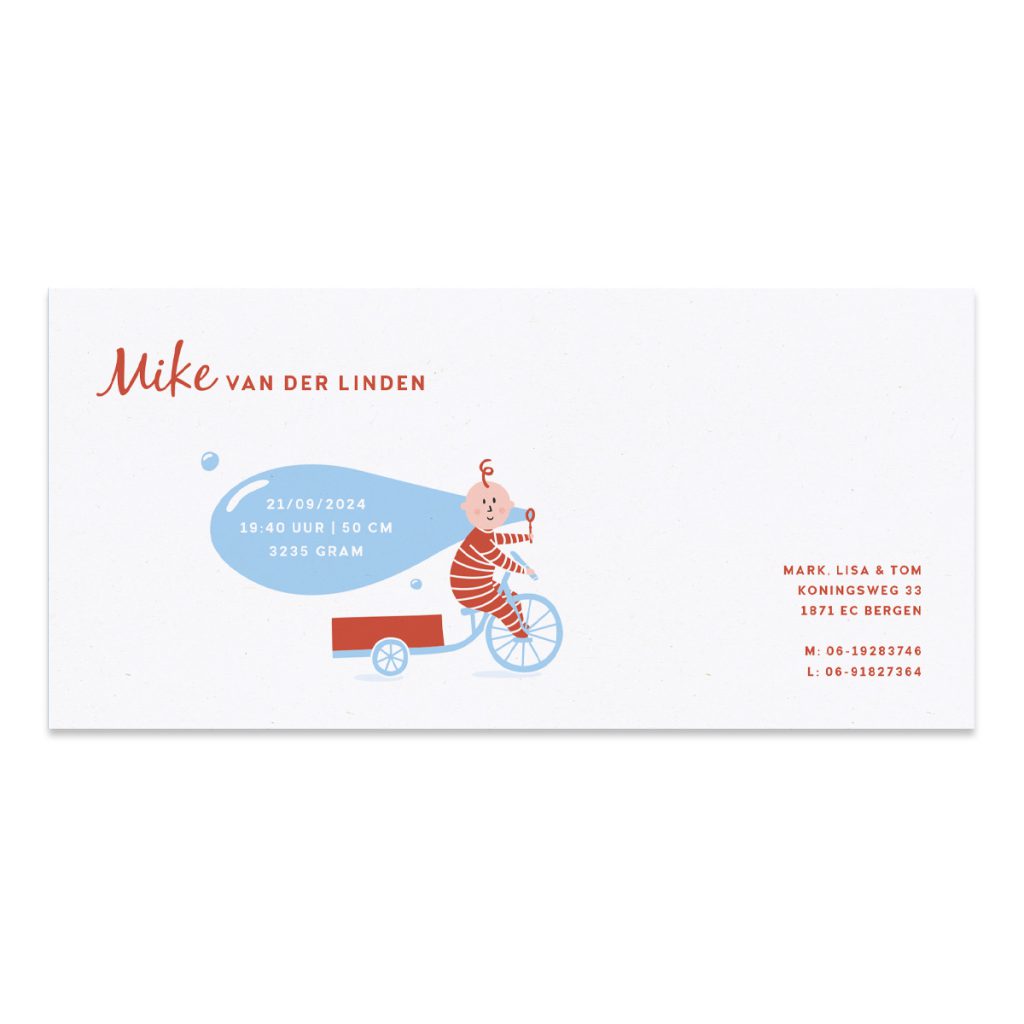 De achterkant van het geboortekaartje olifantje met een vrolijke illustratie van een baby op een fietsje.