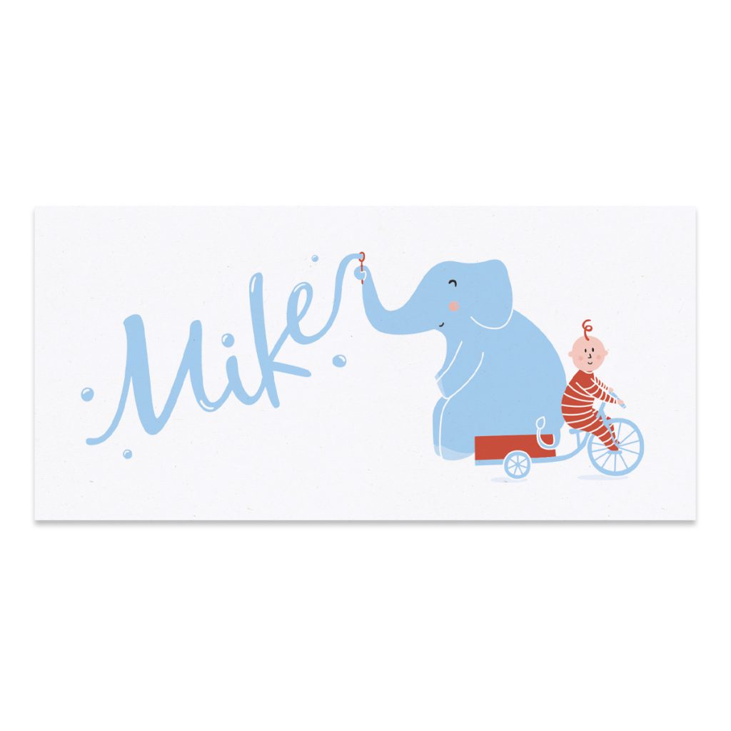 Het geboortekaartje olifantje is vrolijk en elegant. Het is een langwerpig kaartje. De olifant zit achter op de fiets bij een lieve baby en blaast bellen.