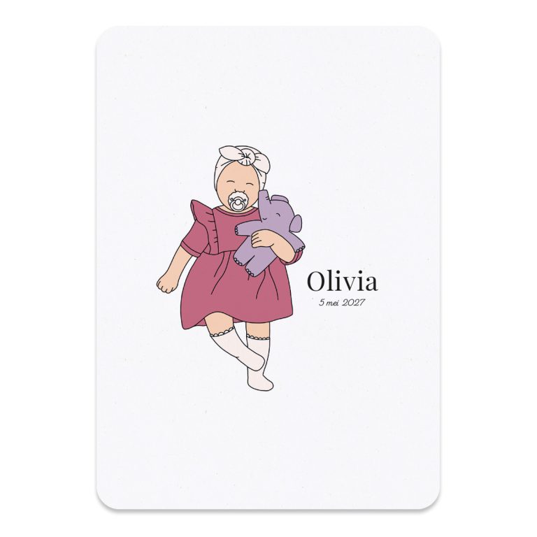 Bekijk hier de stijlvolle en minimalistische geboortekaartjes met een lief kind met een knuffel. Heb je een knuffel voor je kindje en wil je deze graag op het geboortekaartje zien? Stuur me dan gerust een foto. Dan pas ik de knuffel aan op het kaartje aan. Hier zijn geen extra kosten aan verbonden. Ook de kleuren, het lettertype en het formaat van het kaartje kunnen naar wens worden aangepast. Heb je een vraag? Stuur me gerust een berichtje