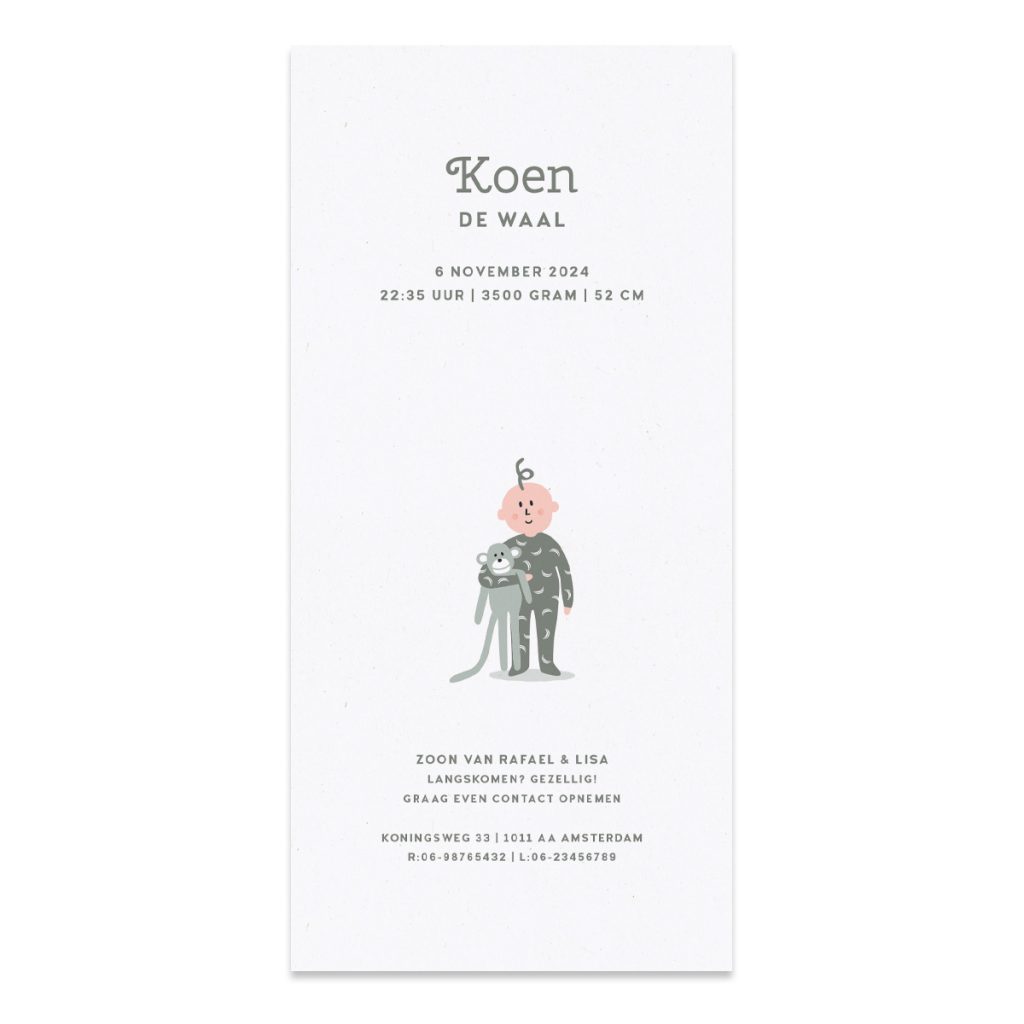 Deze ondeugende kleine staat niets in de weg. Stel jullie kleine boefje aan de wereld voor met dit geboortekaartje met aapje. Het geboortekaartje aapje is 10 x 21 cm en wordt gedrukt op mat gerecycled papier. Het papier heeft een lichte natuurlijke tint en de vezels van het papier zijn licht zichtbaar. Het geeft het kaartje een mooie zachte en elegante uitstraling.