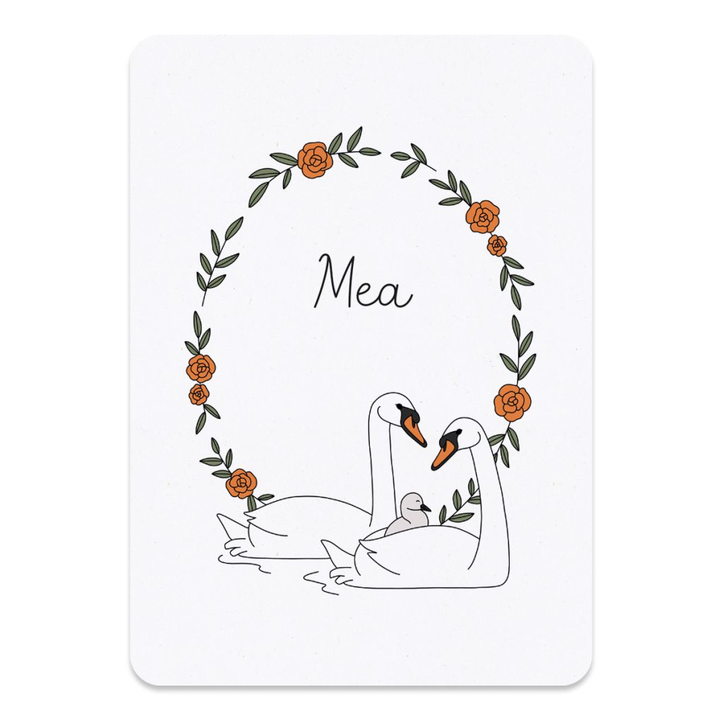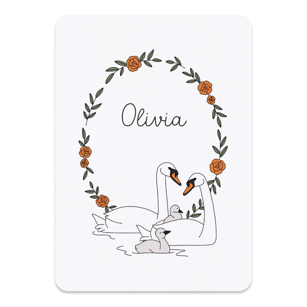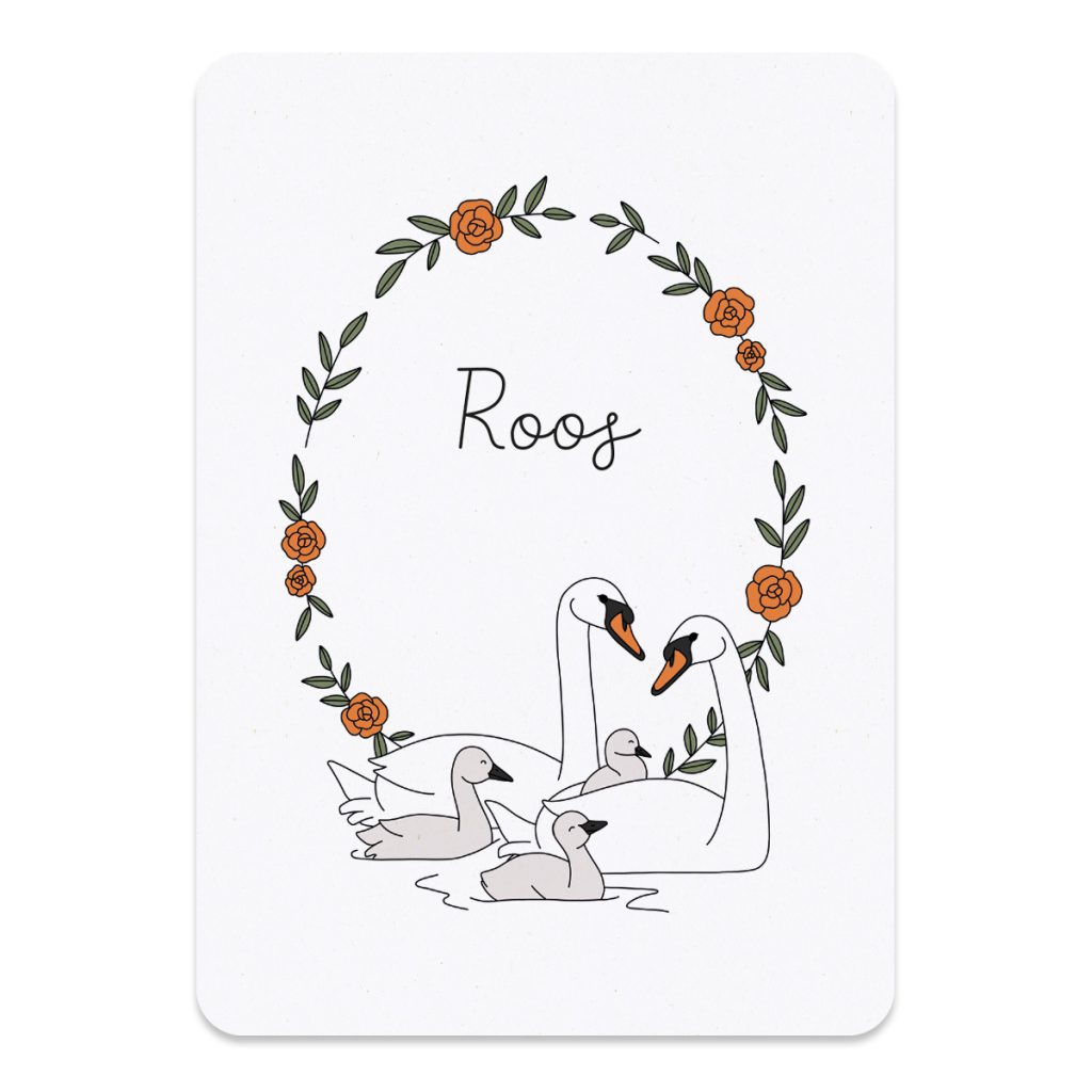 Het geboortekaartje met zwanen en bloemen, is er met 1, 2 of 3 kleine zwaantjes. Het kaartje is A6 formaat (14,8 x 10,5 cm) en heeft ronde hoeken. Het geboortekaartje familie zwaan wordt gedrukt op mat gerecycled papier. Het papier heeft een lichte natuurlijke tint en de vezels van het papier zijn licht zichtbaar. Het geeft het kaartje een mooie zachte, warme en elegante uitstraling.