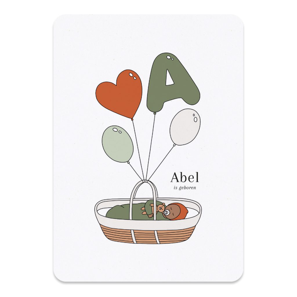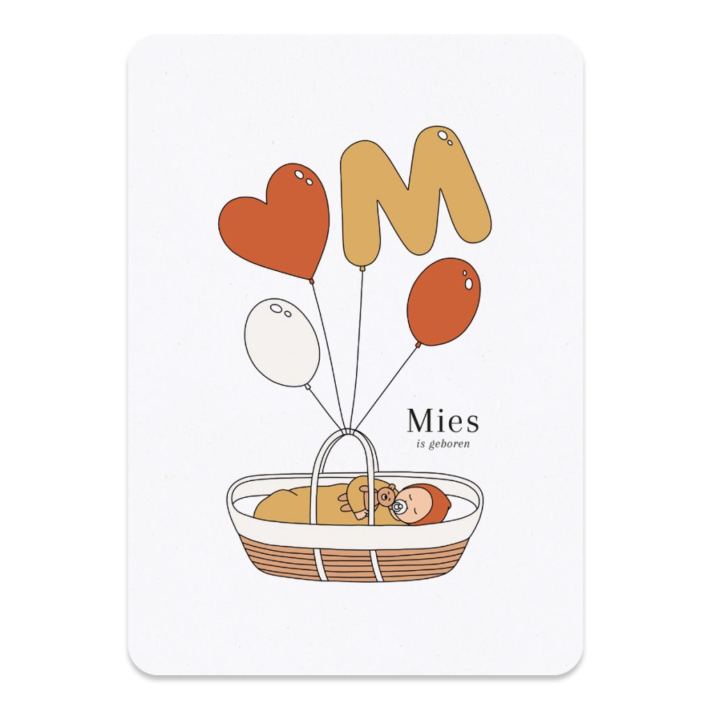 Een warm en vrolijk geboortekaartje met een stijlvolle illustratie van een lief kindje met een teddybeertje, in een mandje en met ballonnen. Een van de ballonnen is de eerste letter van zijn of haar naam. Op de voor- en achterkant van het kaartje staat een hartjes ballon. Het kaartje is A6 formaat (14,8 x 10,5 cm) en heeft ronde hoeken. Het geboortekaartje letterballon wordt gedrukt op mat gerecycled papier. Het papier heeft een lichte natuurlijke tint en de vezels van het papier zijn licht zichtbaar. Het geeft het kaartje een mooie zachte, warme en elegante uitstraling.
